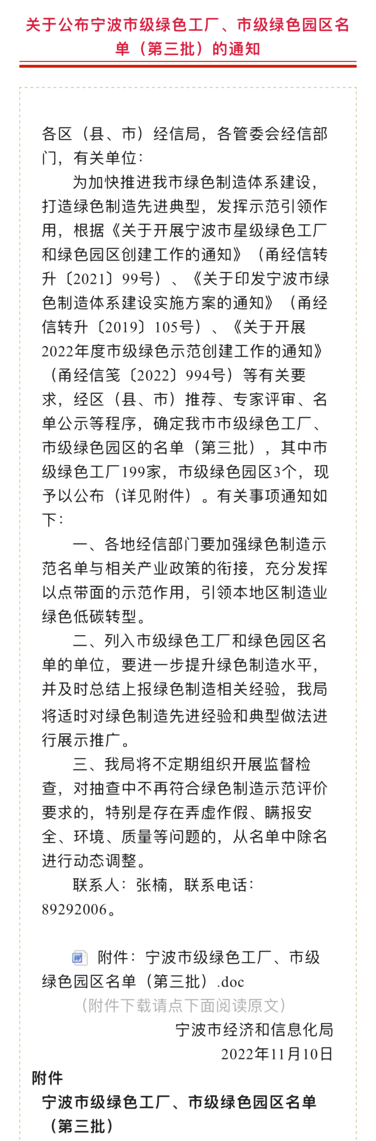 2022年11月18日,寧波市發(fā)布了2022年度寧波市級綠色工廠、市級綠色園區(qū)名單,對符合“綠色發(fā)展”倡導的企業(yè)予以認定,青湖成功入選“綠色工廠”,標志著公司構建低耗高效、持續(xù)環(huán)保的綠色制造體系邁上新臺階。