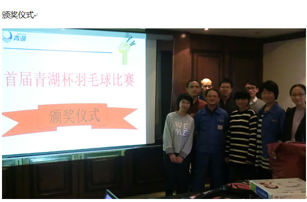 為豐富員工業(yè)余文化生活,增進(jìn)員工之間的交流,給來(lái)自不同部門(mén)的同事搭建八小時(shí)之外的良好溝通平臺(tái),促進(jìn)“和諧青湖、健康青湖、快樂(lè)青湖”建設(shè),2014年11月9日公司在雅戈?duì)栿w育館組織了首屆“青湖杯“羽毛球比賽。本著“我運(yùn)動(dòng)、我健康、我快樂(lè)”的目的,來(lái)自PMC部、質(zhì)量部、IT部、客服部、人事部等員工踴躍報(bào)名參與,攜手并肩向快樂(lè)出發(fā)。